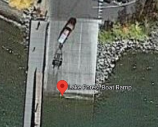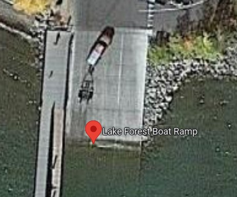 Lake Forest Boat Ramp offers a wide single-lane concrete ramp, courtesy dock, spacious parking area for vehicles and trailers, and a restroom.
